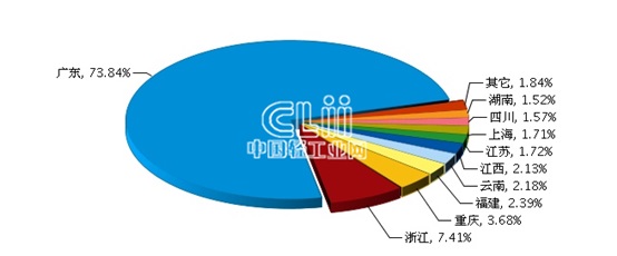 从出口省份来看,广东、浙江、重庆、福建、云南是我国照明行业对东盟出口额排在前五位的地区。其中:广东累计出口额10.59亿美元,占全国出口总额的73.84%,同比增长61.4%。