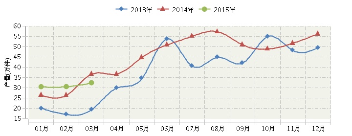 根据国家统计局公布数据2015年1~3月,全国天然毛皮服装行业累计完成产量93.29万件,同比增长11.51%。其中:3月份完成产量32.43万件,同比增长-11.9%。2015年月度数据走势及同比增长情况如下图所示。