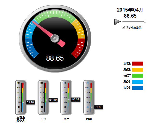 和中国皮革工业协会联合发布2015年4月中轻皮革景气指数。4月份中轻皮革景气指数88.65,较3月的89下降0.35个百分点。其中:主营业务收入景气指数为89.28,出口景气指数为94.89,资产景气指数为95.57,利润景气指数为79.69(参见图1、2)。