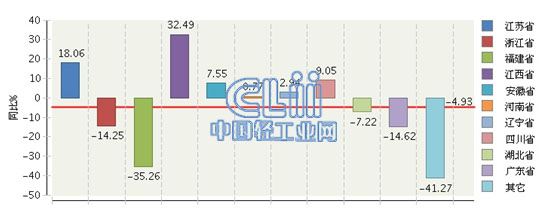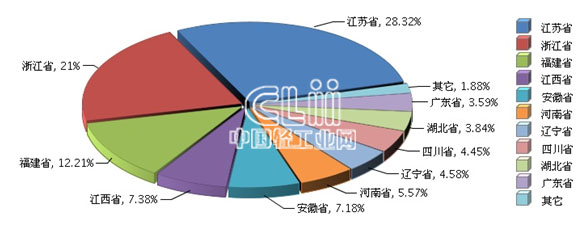 从地区分布来看.比重主要集中在江苏、浙江、福建、江西等地区。其中:江苏累计产量4.46亿只(占28.32%),同比增长18.06%;浙江累计产量3.31亿只(占21%),同比增长-14.25%。