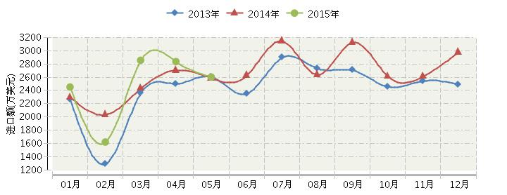 2013-2015年1-5月全国乐器行业月度进口额及同比