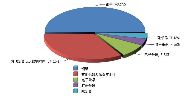 2015年1~5月,钢琴进口额占乐器行业的49.95%,同比增长10.27%;其他乐器及乐器零附件进口额占34.15%,同比下降12.16%;电子乐器进口额占8.36%,同比增长10.63%;打击乐器进口额占4.06%,同比增长41.1%;弦乐器进口额占3.48%,同比增长19.35%。