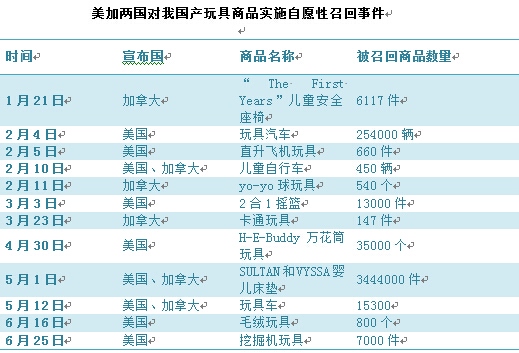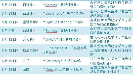 另外今年6月份,山东、上海、河北、浙江及天津5省(市)26家玩具生产企业按照《儿童玩具召回管理规定》的要求,向其所在地省级质量技术监督局备案了主动召回计划,对其生产的26批次存在缺陷的玩具产品实施召回。召回的缺陷玩具产品,因危险夹缝、用于包装玩具的塑料包装袋、安全警示、制动系统、折叠锁定装置、把套拉脱力、小零件、闸把尺寸、刚性材料上的圆孔、尖端方面存在缺陷,有可能造成儿童意外伤害,危及儿童身体健康和生命安全。