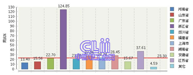 同期,上述10个地区中,浙江的累计利润总额增速(下称“累计增速”)突增至124.85%;江苏、湖南、福建、上海、广东及四川6个地区的累计增速均达到了20%以上,其中前4个地区超过了全国家具行业的平均水平;安徽、山东及河南的累计增速超过了10%,实现了两位数增长(图7)。