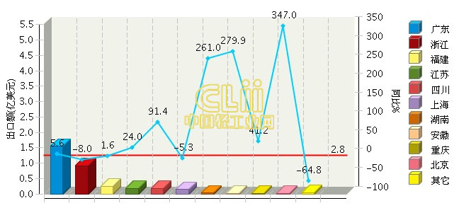 从地区出口情况看,比重主要集中在广东、浙江、福建、江苏、四川等地区。其中:广东完成累计出口额1.54亿美元(占46.55%),同比增长5.58%。