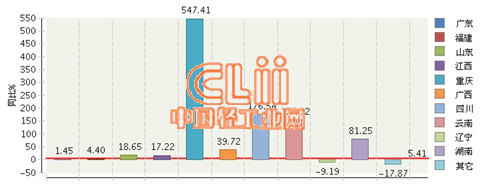 图2 2015年1~9月我国陶瓷砖累计出口额地区同比增长情况