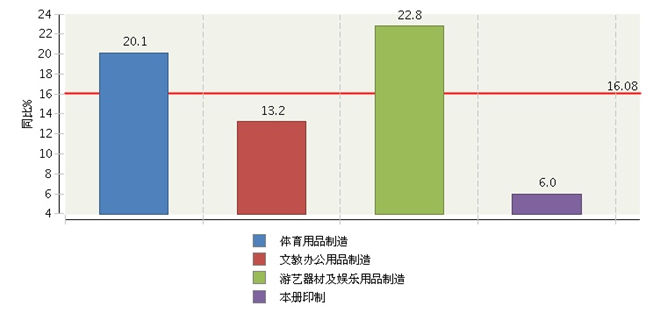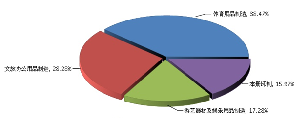 1~10月,体育用品制造完成累计利润总额占38.47%;文教办公用品制造完成累计利润总额占28.28%;游艺器材及娱乐用品制造完成累计利润总额占17.28%;本册印制完成累计利润总额占15.97%。