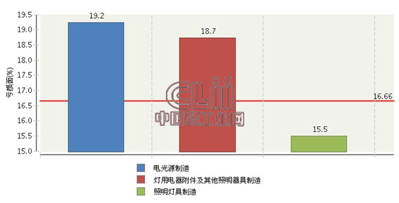 2015年三季度,全国照明行业累计亏损面为16.66%,同比增长1.82%。分子行业看,电光源制造累计亏损面为19.24%,同比增长0.17%;灯用电器附件及其他照明器具制造累计亏损面为18.73%,同比增长3.89%;照明灯具制造累计亏损面为15.49%,同比增长2.03%。