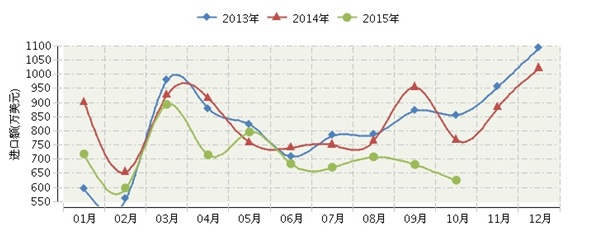 2015年1~10月,全国白炽灯泡行业累计完成进口额7,092.69万美元,同比增长-12.83%。其中: 10月份完成进口额625.68万美元,同比增长-18.59%。