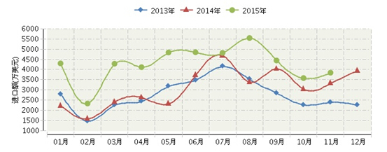 2015年1月~11月,全国玩具行业累计完成进口额47,302.41万美元,同比增长41.32%,较去年同期增速提高了33.56个百分点,玩具进口增长明显。其中:5月份进口额同比增长107.35%,达到三位数增长,是增速最高的月份;7月份进口额同比增长2.7%,是增速最低的月份,但进口总额并不少。