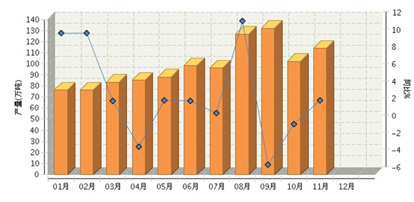 2015年1~11月,全国罐头累计产量1086.36万吨,同比增长1.65%。自年初起产量环比增长,至9月份最高达132.3万吨,10月份产量回调为102.32万吨,同比小幅下降0.15%;11月份完成产量继续回升至114.02万吨,同比增长2.6%。