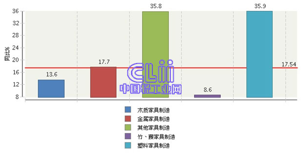 同期,塑料家具制造业和其他家具制造业的累计利润总额增速(下称“累计增速”)基本持平,都达到了35%以上;金属家具制造业的累计增速略高于家具行业平均增速,为17.73%;木制家具制造业、竹、藤家具制造业都在行业平均线以下,前者保持10%以上增长,后者为个位数增长(图5)。
