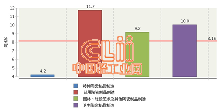 据国家统计局数据显示,2015年1~12月特种陶瓷完成累计主营业务收入同比增长4.22%,占全国陶瓷行业主营业务收入(下同)的35.38%;日用陶瓷累计同比增长11.72%,占26.93%;园林、陈设艺术及其他陶瓷累计同比增长9.17%,占21.42%;卫生陶瓷累计同比增长10.05%,占16.27%。