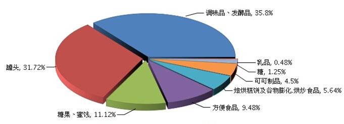 2016年1~4月,在全国食品行业累计出口额中,调味品、发酵品完成累计出口额占35.8%,同比增长1.6%;罐头累计出口额占31.72%,同比增长-12.95%;糖果、蜜饯累计出口额占11.12%,同比增长3.29%;方便食品累计出口额占9.48%,同比增长-0.93%;焙烘糕饼及谷物膨化.烘炒食品累计出口额占5.64%,同比增长-1.79%;可可制品累计出口额占4.5%,同比增长-12.2%;糖累计出口额占1.25%,同比增长211.14%;乳品累计出口额占0.48%,同比增长-22.73%。