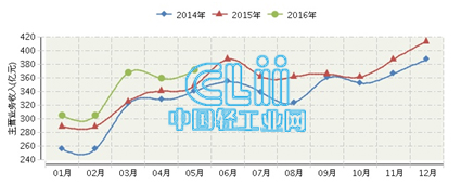 2016年全国照明行业连续三年月度主营业务收入对比