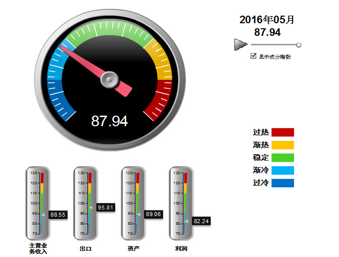 2015年4月至2016年5月,中轻皮革景气指数基本稳定,在90附近小幅波动,处于稳定提示区的下半区运行,至5月已经在渐冷提示区运行15个月(参见图3)。