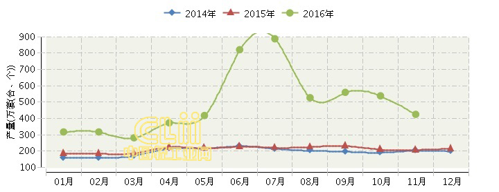 2016年河南灯具及照明装置行业连续三年月度产量对比