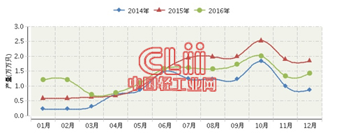 2016年河南电光源行业连续三年月度产量对比