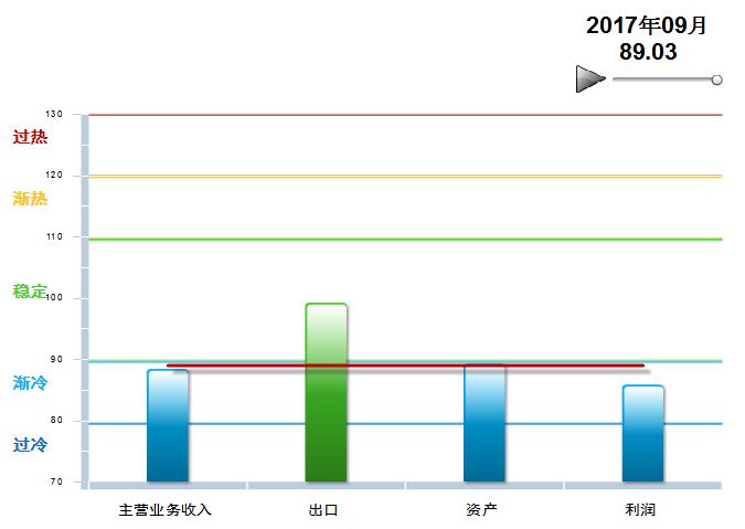 2016年8月至2017年9月,中轻皮革景气指数基本稳定,在90附近小幅波动,处于渐冷提示区运行(参见图3)。