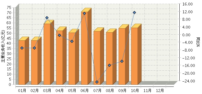 2017年1月~10月,全国金属工艺品制造行业累计完成主营业务收入531.57亿元,同比增长-2.72%。其中:1月份完成主营业务收入42.94亿元,同比增长-4.97%;2月份完成主营业务收入42.94亿元,同比增长-4.97%;3月份完成主营业务收入59.11亿元,同比增长10.69%;4月份完成主营业务收入52.55亿元,同比增长1.61%;5月份完成主营业务收入50.5亿元,同比增长-1.5%;6月份完成主营业务收入70.83亿元,同比增长12.93%;7月份完成主营业务收入51.8亿元,同比增长-22.72%;8月份完成主营业务收入50.72亿元,同比增长-13.94%;9月份完成主营业务收入54.83亿元,同比增长-11.88%;10月份完成主营业务收入55.35亿元,同比增长13.44%。