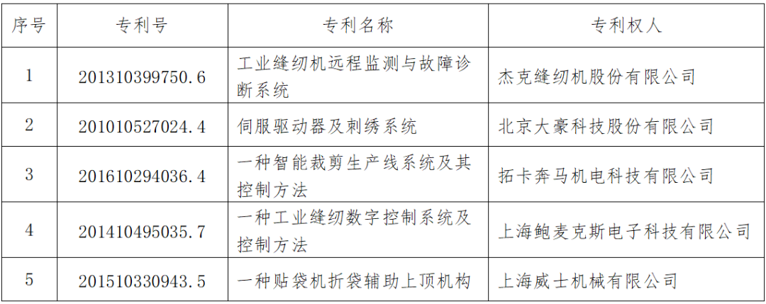 近日,国家知识产权局发布第二十一届中国专利奖授奖决定,其中缝制机械领域共5个项目荣获中国专利优秀奖,名单如下: