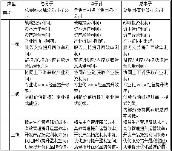 2) 二级的分公司和事业部都是在总部“分权”下进行区域维度或业务性质维度进行的产业发展统筹中心,通过企业链创造价值;而二级的子公司是在总部“授权”下进行的产业投资中心,通过产业链创造价值。