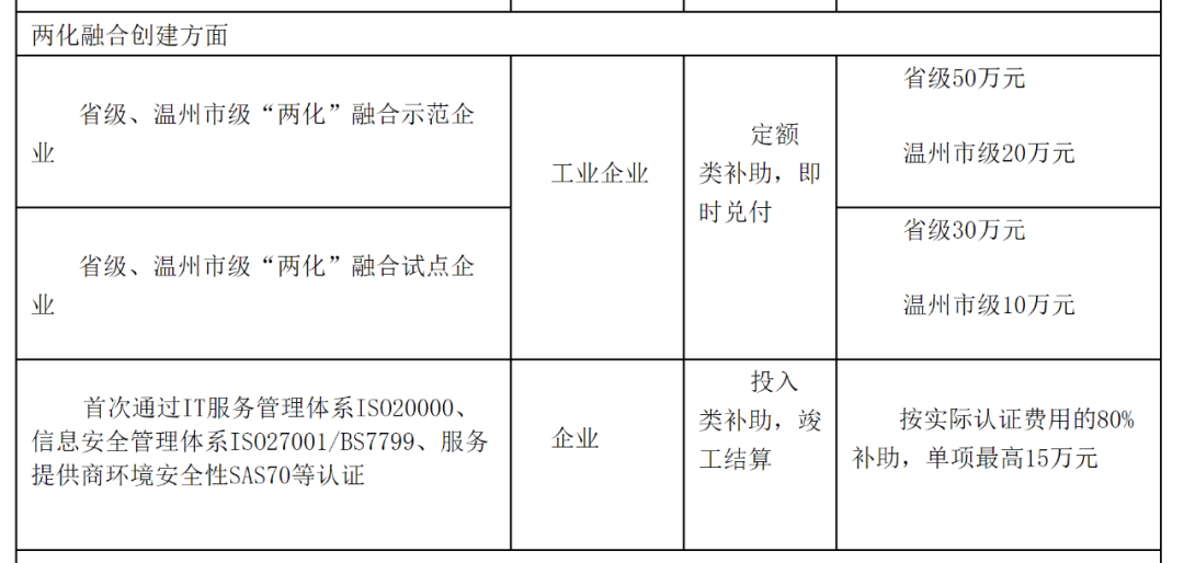 7月发布的温州市人民政府关于全面加快科技创新推动工业经济高质量发展的若干政策意见提出,新认定的制造业与互联网融合发展试点示范项目(企业)、个性化定制示范企业、网络协同制造示范企业,按照国家级、省级分别奖励50万元、30万元;每年遴选40家以内市级两化融合示范试点企业,给予15万元奖励;新认定的省上云标杆企业奖励10万元;通过国家两化融合管理体系贯标认定的企业奖励15万元。