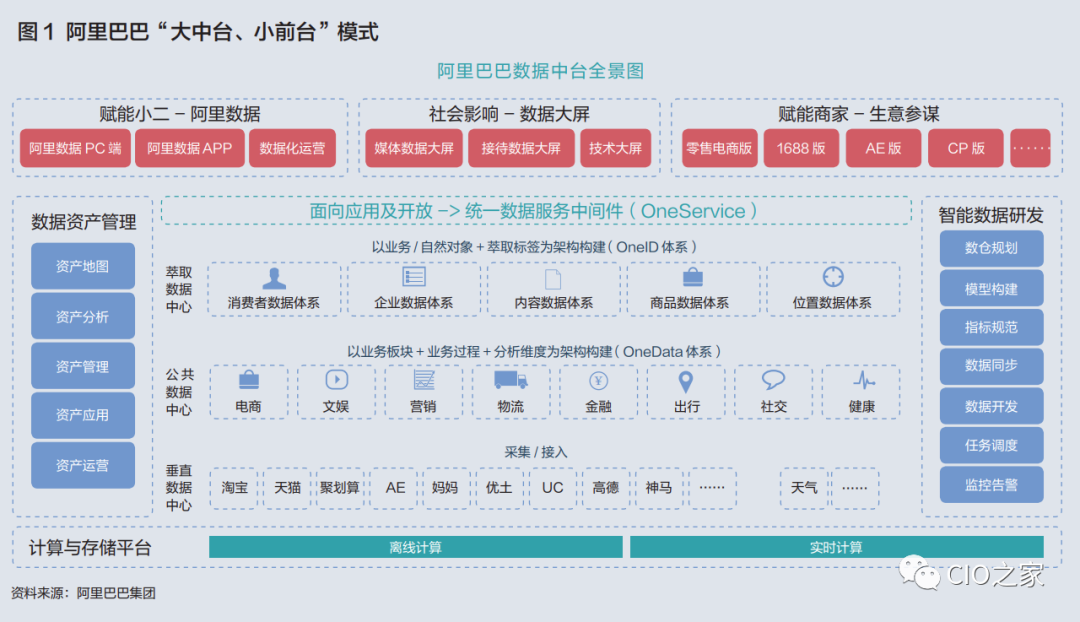中台战略源于互联网企业,是企业适应数字业务的快速发展和外部竞争环境变化的产物。随着企业规模不断扩大,业务走向多元化发展,2015年12月阿里巴巴启动三年(2015~2018年)的中台战略。当时阿里中台战略的初衷是解决资源浪费和效率低下的问题,其核心是将不同业务线共同用到的数据和技术(软、硬件以及分析技术工具)加以整合、沉淀,成立专门的中台部门,统一支持前台业务需求。中台的形式使得企业可以不用重新设计、开发来自不同部门的新业务需求,从而避免重复功能建设和维护带来的资源浪费,也极大地解决了前台“烟囱林立”、新业务创新、开发效率低下的问题。以强大的中台来支持众多业务线,阿里称其为“大中台,小前台”的中台战略,这成为阿里之后数据和业务中台双中台结构的基础。