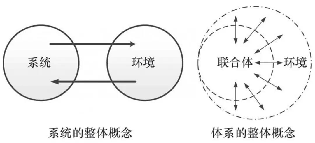 而在体系的整体概念里,联合体与环境之间边界模糊或者不划分边界,它们都是体系的一部分,并且环境是动态开放的。