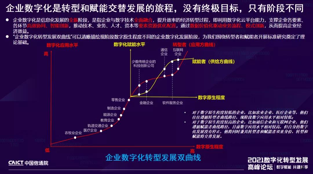 栗蔚表示,企业的数字化是转型和赋能交替发展的旅程,或因其在数字化进程中对数字化技术的应用程度不同,处于不同阶段并扮演不同的角色。农牧业企业、制造企业、交通企业等传统行业企业目前正处于通过深化运用数字化技术开展自我转型的阶段,转型者属性明显;而金融、通信等行业的企业,在通过数字化技术实现自我转型的同时,具备将相关能力沉淀并向外输出,兼备转型者和赋能者角色;互联网企业生来具备强烈数字化基因,是天生的的赋能者,但同样不得忽视自身的持续转型发展。