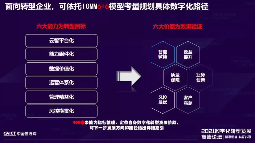 IOMM依托“6+6”模型帮助转型者计划未来发展方向。企业IT数字化能力和运营效果成熟度模型(IOMM)拥有近400条能力指标,可用于梳理和定位企业数字化转型发展阶段,对企业下一步发展方向和路径给出详细指引。IOMM以六大能力和六大价值为评判依据。六大能力主要包括:云智平台化、能力组件化、数据价值化、运营体系化、管理精益化、风控横贯化。它以效果和价值为导向,能够带来智能敏捷、效益提升、质量保障、业务创新、风控最优和客户满意六大价值。