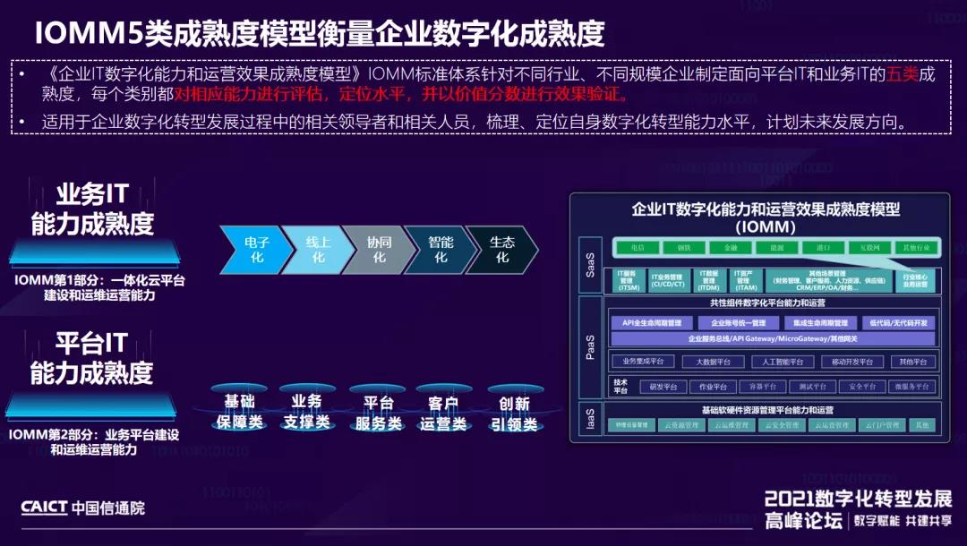 企业IT数字化能力和运营效果成熟度模型(IOMM)针对不同行业、不同规模企业制定面向平台IT和业务IT的五类成熟度。其中,平台IT成熟度主要包括基础保障类、业务支撑类、平台服务类、客户运营类和创新引领类五类。业务IT成熟度主要包括电子化、线上化、协同化、智能化、生态化五类。每个类别都对相应能力进行评估,定位水平,并以价值分数进行效果验证。