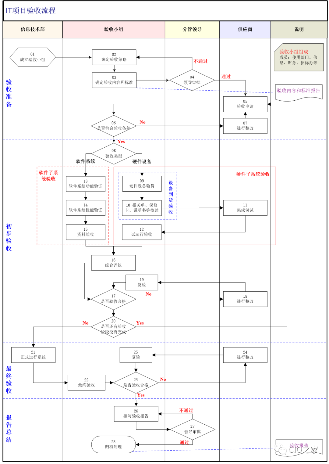 如果本次验收通过,验收小组将检验初步验收涉及的各阶段验收是否完成,如果初步验收完成,将进入正式运行阶段;如果还存在后续验收阶段,将重复5至19的步骤,直至所有子系统验收合格。对于一些国家或监管部门有相应法规约束的特殊项目,是否通过相关外部验收将是项目初验合格的基础,如机房工程需要通过消防局、电力等部门的验收,网络系统需要通过保监会的验收等。