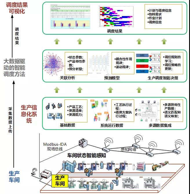 数字-智能技术的发展当然不会止步于设计有序,因为企业生产的目标当然希望运行有序。既然静态的数据不足以反映实际情况,为什么不考虑动态数据?既然单向的数据流动不足以反映出现异常后的事物关联,为何不通过数据的融合解决此问题?数字-智能技术即通过动态的、融合的数据去驱动生产计划调度,从早期的确定性调度进化到随机调度,从静态调度进化到动态调度。确定性调度是指与生产调度相关的参数在进行调度前都已预知的调度。随机调度针对的情况是指诸如加工时间、交货期等生产调度参数中至少有一个是概率分布已知的随机变量。静态调度是指所有待安排加工的工件在开始调度时刻均处于待加工状态,即假定调度环境是确定已知的,因而进行一次调度后,各作业的加工即被确定,在调度执行过程中不再改变。动态调度是指作业依次进入待加工状态,各种作业不断进入系统接受加工,同时完成加工的作业又不断离开。与此同时,还要考虑作业环境中不断出现的动态扰动(设备损坏、作业加工超时、交货期提前和紧急订单插入等),需要在调度执行过程中跟踪车间的实际状况对调度方案进行修改和更新。图2是大数据驱动的车间生产智能调度方法架构。简言之,欲使生产真正运行有序,就必须考虑实际的、动态的变化,必须考虑那些不确定的因素。而这种考虑是基于动态多元数据的融合与关联分析,分析的基础不乏智能方法。