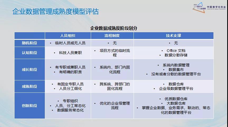 企业数据成熟度阶段分为随机阶段、认知阶段、成长阶段、成熟阶段、创新阶段。认知自身所处的数据成熟度,对于企业来说十分必要。目前,制造行业的信息化建设已取得显著效果,企业普遍希望通过数据治理为建设数据应用夯实基础,从而实现数据价值。