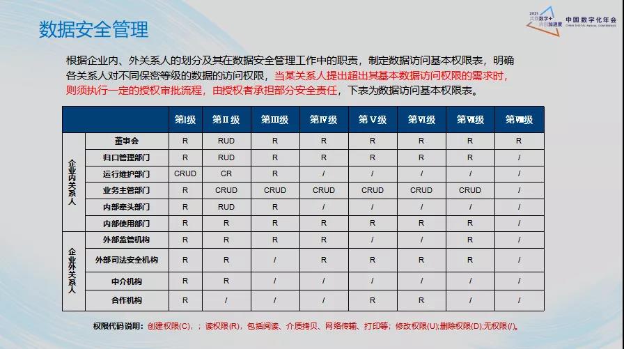 目前,数据安全管理存在很大的风险,数据安全是大家常谈的热点问题。根据企业内、外关系人的划分及其在数据安全管理工作中的职责,制定数据访问基本权限表,明确各关系人对不同保密等级的数据的访问权限,当某关系人提出超出其基本数据访问权限的需求时,则须执行一定的授权审批流程,由授权者承担部分安全责任。
