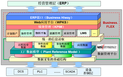 Honeywll MES是典型的平台化解决方案,数据集成管理平台(Uniformance)、Web应用平台(WPKS)、计算引擎(BizCalc,一个高级计算管理工具,可以对各类数据进行大量复杂计算处理和验证,为MES其他应用模块或者外部的其他应用系统提供数据基础)以及报表工具等构成了Honeywll MES的基础平台,Business.FLEX的所有业务模块都是基于Uniformance数据平台运行的。