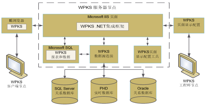 (1)数据层:包括PHD 实时数据库、Oracle 和SQL 关系数据库。这3种数据库的数据通过WPKS 的数据服务器上传。
