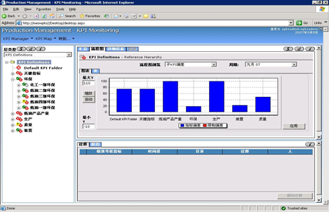 KPIM能够与MES其他应用连接在一起,持续地报告结果。KPIM是一个标准的Business.FLEX PKS应用,它能够利用Business.FLEX PKS的应用——工厂参考模型配置,共享其他应用的结果。比如说,现有的操作统计出的偏差能够容易地与KPIM联系起来。图4所示为一KPI监视页例图。