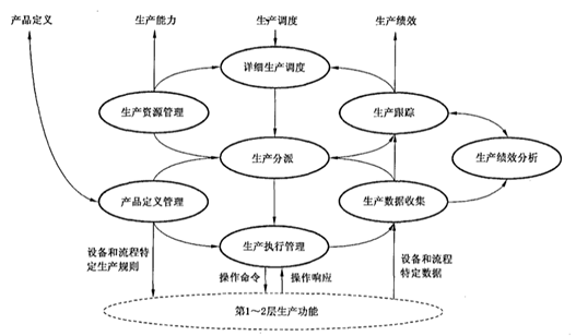 在上述模型中(图2),生产资源管理提供关于制造系统资源的相关信息,包括设施、设备、物料等,并向企业计划系统(如ERP)报告当前哪些资源可用,从而回答车间生产能力的问题。产品定义管理提供关于如何生产一个产品的信息,管理与产品制造相关的活动。详细排产则根据计划系统下达的生产订单,基于车间资源和当前生产任务的状况,制定详细的排产计划(包括生产顺序和生产时间),从而回答车间在什么时间生产什么的问题。生产分派是将生产作业计划分解成作业任务后派发给相应的人员或设备,启动产品生产过程;而生产执行则是保证分派的作业任务得以完成。生产跟踪是指跟踪车间生产过程,包括物料移动、设备或过程段的启停时间、生产系统关键性能指标(KPI)等,向企业计划系统报告在生产时间生产了什么。生产绩效分析是通过对采集到的车间数据进行分析,确认生产过程完成及其绩效情况。生产数据采集是从现场控制系统(PCS)通过自动、半自动或人工方式(如RFID、扫描枪、键盘等)采集生产事件、设备状态等信息,为生产执行、生产跟踪和生产绩效分析提供数据与信息来源。