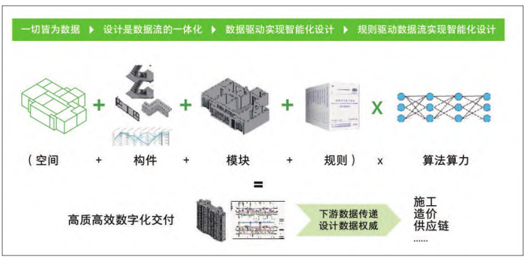 设计的理想场景中,设计业态及边界将作为条件信息输入,经过数字设计平台中集成化的生成和加工,考虑全专业、全过程的因素,进而输出设计成果。随着业务的积累,通过数字设计平台生产的数据又能沉淀成为企业的数据资产,不断地输入到数字设计平台中继续丰富优化智能算法。值得一提的是,智能化是人智能和机器计算能力组合的结合,随着数字化程度深入,机器计算与人的智能比重会越来越大,自动化的程度会越来越高,而人会越来越聚焦于需求和边界条件的确定。让设计师解放双手,更好地聚焦在创意上,让设计回归本原。