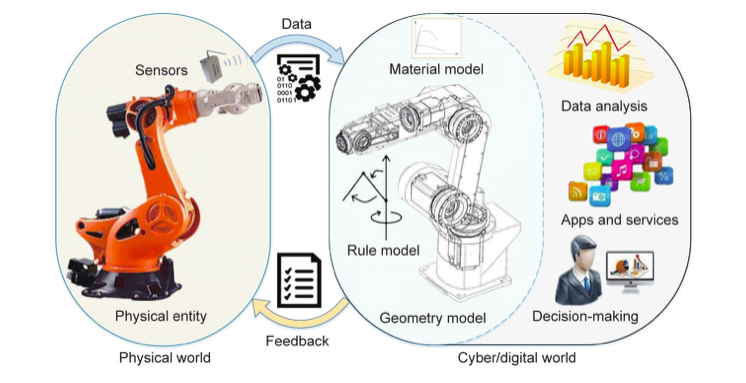 DT是与信息物理融合相关的另一个概念。DT是在虚拟空间中创建物理对象的高保真虚拟模型,以模拟其在现实世界中的行为并提供反馈。DT反映了双向动态映射过程。它打破了产品生命周期的隔离,提供了完整的产品数字足迹。因此,DT使公司能够更快、更准确地预测和检测物理问题,优化制造流程,并生产更好的产品。