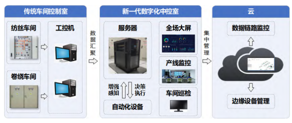 第一,各控制系统配备有独立的显示屏,用于展示系统的生产状态及数据。但是,该方法无法展示出沿丝路全程的生产状况,数据也仅能在单机上显示。通过引入基于化纤工业智能体打造的新一代数字化中控室,可以对化纤工厂各控制系统中的数据进行采集汇聚,打通控制系统之间的“数据孤岛”,实现沿丝路生产全程、全量数据的采集、汇聚与融合。