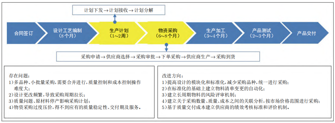 作为一个复杂的电子装备,从合同签订至产品交付,整个项目周期持续约22 ~ 25个月,其整体业务流程及每个子业务的基本流程如图3所示。项目实施过程涉及企业内多个部门,审批流程多,周期长。另外,业务过程复杂多变,沟通协调难度大。