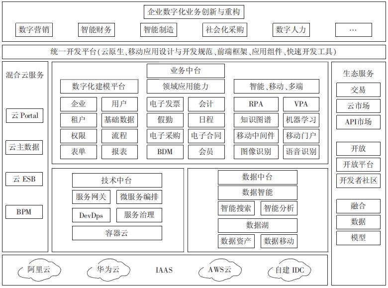 基于云原生和微服务的应用支撑平台,支撑快速建模开发与流水线发布的规模化应用在线构造与融合运行,构建可持续沉淀的敏捷业务中台架构、继承式多维度的个性化定制、应用快速构造与融合运行等技术,支撑大规模企业应用生态建设运营,构建支持混合云部署的集团企业智能ERP平台及其智能化管理解决方案。