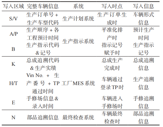 表 1 是车辆SF(日程文件)信息录入的过程,简单来说,就是在不同的生产阶段在车辆SF的相应区域中登录车辆基本信息、生产信息和品质追溯信息。
