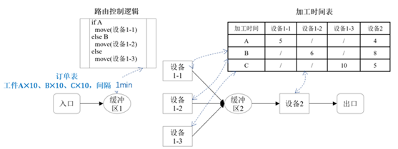 如图2所示,当工件离开缓冲区1之前,将执行预定义的“路由控制逻辑”,依据工件类型确定目的位置,当工件进入设备后,读取“加工时间表”,正确设置工件加工加工时间。