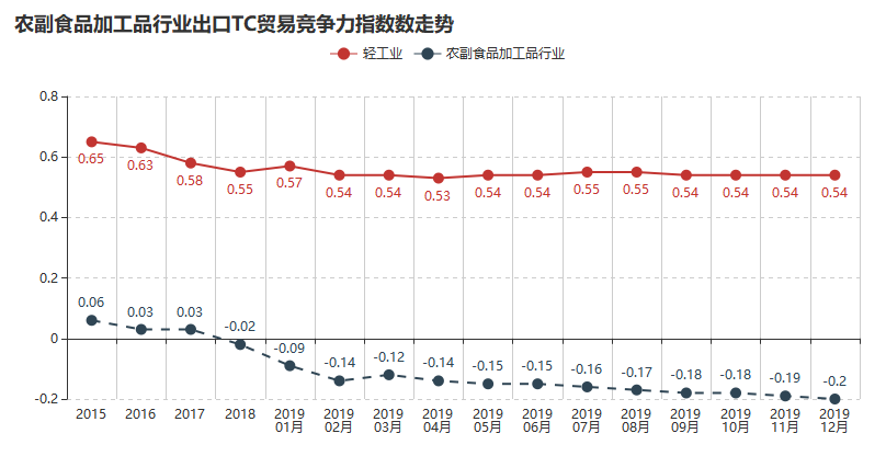 2019年12月农副食品加工业贸易竞争力指数-0.2