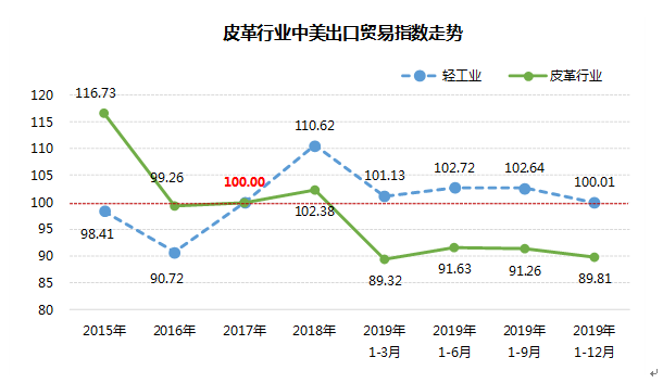 2019年1-12月皮革行业中美出口贸易指数89.81