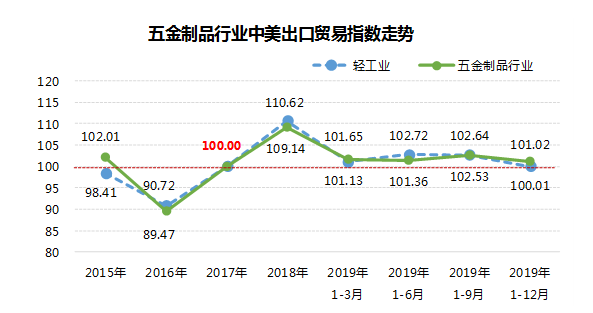 2017年,五金制品行业对美累计出口额为99.6亿美元,2018年为108.7亿美元,2019年为100.60亿美元。从指数走势看,五金制品中美出口贸易指数与轻工业高度重合,中美贸易摩擦发生以来五金制品中美出口贸易指数先升后降,但仍在100临界值以上运行。2019年1-12月五金行业中美出口贸易指数为101.02,较1-9月小幅下降1.51点,中美经贸摩擦影响总体可控。